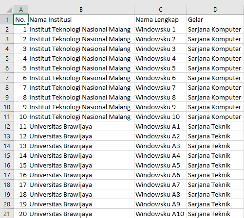 Untuk sertifikat yang penulis buat, penulis memiliki data Nama Institusi, Nama Lengkap, dan Gelar. Jika anda perhatikan, sertifikat yang sudah diubah memiliki kolom “[nama_kolom]”. Nah, kolom tersebut yang nantinya akan kita ubah sesuai dengan data yang ada di Excel. Kemudian untuk isi sertifikat, silahkan sesuaikan dengan kebutuhan anda atau mengikuti seperti gambar diatas.