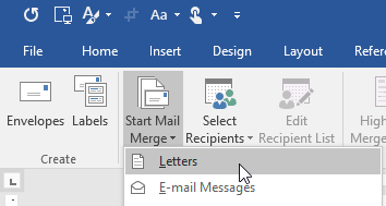 Untuk membuat sertifikat dengan data dari Microsoft Excel, kita akan menggunakan fitur Mail Merge yang ada di Microsoft Word. Tahap pertama, silahkan anda pilih jenis Mail Merge. Dalam tutorial ini, penulis menggunakan “Letters”.